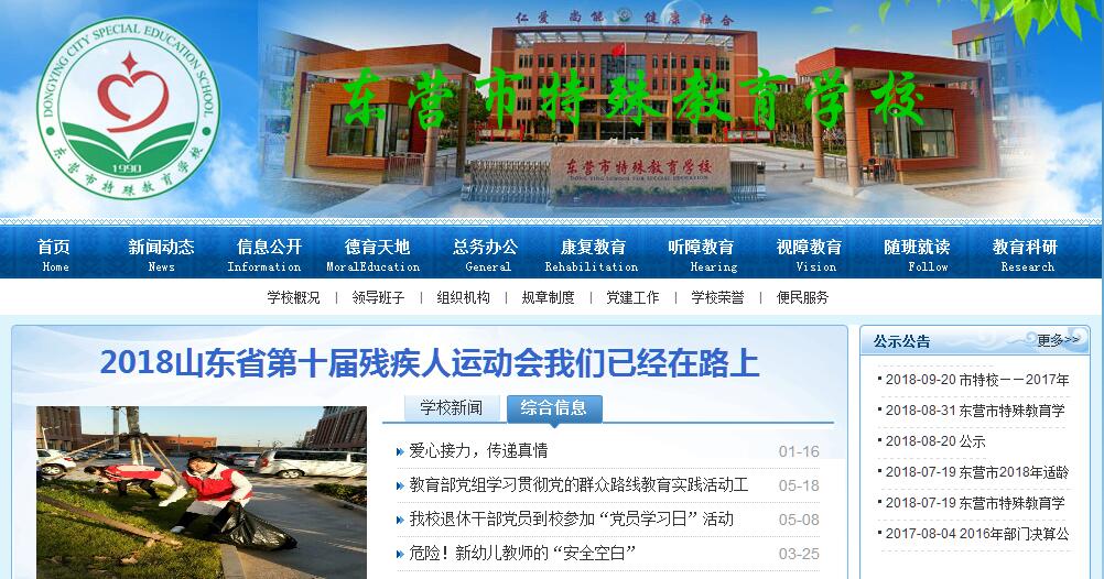 東營市特殊教育學(xué)校坐落于東營市東城,前身為市盲聾童學(xué)校,是一所對全市盲聾兒童、少年實(shí)施學(xué)前教育、義務(wù)教育和職業(yè)高中教育的特教學(xué)校。校園占地50畝,學(xué)?,F(xiàn)有在校生256人,教職工91人,專任教師72人,專任教師學(xué)歷達(dá)標(biāo)率100%。 2002年實(shí)現(xiàn)了殘疾學(xué)生全免費(fèi)就讀,極大地提高了學(xué)生的入學(xué)率和鞏固率。學(xué)校積極借鑒先進(jìn)教育經(jīng)驗和陶行知教育思想,努力抓好“個別化教學(xué)”、“主題性教學(xué)”和“情景教學(xué)”三大主題的試驗推廣和階段總結(jié),以培養(yǎng)殘疾學(xué)生的自立自強(qiáng)精神和生存發(fā)展能力為主方向,使每個學(xué)生得到適合其自身發(fā)展需要的教育。學(xué)校教育科研成果顯著,多篇論文在各級報刊上發(fā)表或獲獎,多項省市級課題通過鑒定。學(xué)生的書畫作品及文藝節(jié)目多次在全國或省市組織的活動中獲獎,多名學(xué)生榮獲“黃河口好少年”和“少先隊雛鷹獎?wù)隆钡葮s譽(yù)稱號。 學(xué)校先后被評為東營市文明校園建設(shè)先進(jìn)單位、市級文明單位、東營市殘疾人之家、山東省教師職業(yè)道德建設(shè)先進(jìn)集體、山東省特殊教育先進(jìn)單位、省級規(guī)范化學(xué)校等榮譽(yù)稱號。多名同志被評為全國特殊教育工作先進(jìn)個人、省市級教學(xué)能手等榮譽(yù)稱號。