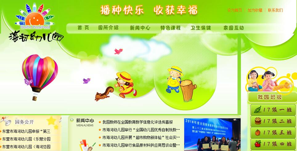 東營市海河幼兒園成立于1997年,隸屬于東營市教育局,是我市第一所省級十佳幼兒園。自2013年領(lǐng)辦樂慧分園, 全園占地面積40畝,建筑面積14100平方米,現(xiàn)開設(shè)小、中、大年齡段共32個教學班,在園幼兒1400余人,教職工180人。園內(nèi)自然環(huán)境優(yōu)雅、美麗,人文環(huán)境和諧、積極,教職工團隊氛圍融洽,工作條理有序,幼兒發(fā)展全面,教育口碑皆贊。幼兒園秉持“播種快樂 收獲幸?!钡霓k園理念,在長期的教育實踐中探索積淀形成了尊重幼兒天性的“快樂教育”特色品牌。以培養(yǎng)“終身受用的個性品質(zhì),終身受益的行為習慣,終身幸福的快樂感受”為幼兒培養(yǎng)目標。積極創(chuàng)設(shè)游戲化、生活化、探究性、藝術(shù)感的教育環(huán)境,讓每個幼兒在自主游戲、探索嘗試、交往合作中追求快樂、體驗成功。幼兒園踐行“勤學習、善研究,重實踐、善反思,會合作、能創(chuàng)新”的教師培養(yǎng)目標,著力打造“管理精細、隊伍精良、環(huán)境優(yōu)美、特色鮮明”的現(xiàn)代化幼兒園。幼兒園先后榮獲:山東省十佳幼兒園、全國百佳幼兒園、意大利瑞吉歐幼兒教育體系中國化研究先進科研集體、市級餐飲安全示范單位、全市師德建設(shè)先進集體、全市學前教育工作先進單位、市級文明單位、以園為本教研制度建設(shè)先進單位、東營市首批六星級平安校園、東營市首批教育現(xiàn)代化學校等100多項榮譽稱號。