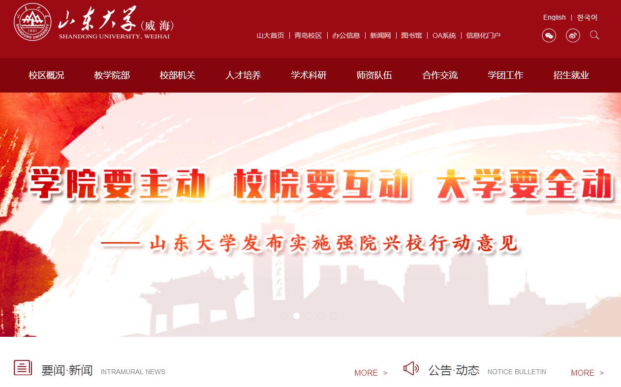 山東大學(xué)是一所歷史悠久、學(xué)科齊全、學(xué)術(shù)實(shí)力雄厚、辦學(xué)特色鮮明,在國內(nèi)外具有重要影響的教育部直屬重點(diǎn)綜合性大學(xué),是世界一流大學(xué)建設(shè)高校(A類)。山東大學(xué)(威海)創(chuàng)建于1984年,是山東大學(xué)與威海市政府聯(lián)合共建的多學(xué)科、開放式、綜合性大學(xué)校區(qū)。她的誕生,開創(chuàng)了我國名校異地辦學(xué)的先河;她的成長,印證了改革開放以來我國高等教育不斷深化改革與科學(xué)發(fā)展的光輝歷程。學(xué)校建筑面積近50萬平方米,現(xiàn)有11個學(xué)院和1個教學(xué)部,46個本科專業(yè),涵蓋文學(xué)、藝術(shù)學(xué)、法學(xué)、經(jīng)濟(jì)學(xué)、管理學(xué)、理學(xué)、工學(xué)和醫(yī)學(xué)等八大學(xué)科門類,可在25個一級學(xué)科招收碩士研究生、17個一級學(xué)科招收博士研究生,同時可在18個一級學(xué)科招收博士后,已形成了培養(yǎng)博士生、碩士生、本科生、國際學(xué)生等多層次的教育體系?,F(xiàn)有全日制統(tǒng)招本科生14900余人,國際學(xué)生1000余人,博碩士研究生1400余人;教職工1240余人,其中教授、副教授379人,博士、碩士生導(dǎo)師422人。學(xué)?;A(chǔ)教學(xué)設(shè)施完備。圖書館擁有中外文藏書157萬冊,電子圖書250萬冊,各類中外文電子文獻(xiàn)數(shù)據(jù)庫200余個,是集文獻(xiàn)服務(wù)、知識服務(wù)、個性化服務(wù)于一體的多類型、多層次、全開放式管理的現(xiàn)代化圖書館。教學(xué)、科研實(shí)驗(yàn)室68個,語音室24個,多媒體教室197個,并建有先進(jìn)的智慧教師、云教室和同聲傳譯實(shí)驗(yàn)室等,教學(xué)、科研儀器設(shè)備2萬余臺(套),多媒體教室和語音室座位數(shù)1.9萬多個。在山東大學(xué)一體發(fā)展框架下,威海校區(qū)堅(jiān)持“一項(xiàng)計劃、兩大戰(zhàn)略、三型校區(qū)”的發(fā)展規(guī)劃,即深入實(shí)施“學(xué)術(shù)提升計劃”,貫徹落實(shí)“特色立校戰(zhàn)略和人才強(qiáng)校戰(zhàn)略”,努力建設(shè)“異地辦學(xué)的示范性校區(qū)、堅(jiān)持特色發(fā)展的高水平校區(qū)、加強(qiáng)國際合作的開放式校區(qū)”,不斷提升校區(qū)學(xué)術(shù)競爭力、社會影響力和國際化水平,加快建設(shè)成為山東大學(xué)創(chuàng)建世界一流大學(xué)的新亮點(diǎn)。學(xué)校堅(jiān)持深化教育教學(xué)改革,人才培養(yǎng)質(zhì)量穩(wěn)步提高。已有國家級和省級精品課程18門,朝鮮語專業(yè)為國家級特色專業(yè),另有省級品牌專業(yè)及特色專業(yè)12個,省級優(yōu)秀教學(xué)團(tuán)隊(duì)4個,國家、省級優(yōu)秀教材14部;國家級教師教學(xué)發(fā)展示范中心分中心1個,省級實(shí)驗(yàn)教學(xué)示范中心3個,省級雙語教學(xué)示范課程3門,省級教學(xué)研究與教學(xué)改革項(xiàng)目30項(xiàng);鼓勵學(xué)生積極開展科技創(chuàng)新活動,已獲國家大學(xué)生科技創(chuàng)新項(xiàng)目167項(xiàng),參加中國“互聯(lián)網(wǎng)+”大學(xué)生創(chuàng)新創(chuàng)業(yè)大賽、大學(xué)生數(shù)學(xué)建模競賽、電子設(shè)計競賽、智能汽車競賽、節(jié)能減排社會實(shí)踐與科技競賽、機(jī)電產(chǎn)品創(chuàng)新設(shè)計競賽、“挑戰(zhàn)杯”等課外學(xué)術(shù)科技競賽,近三年獲得國家獎90多項(xiàng),省級獎1000余項(xiàng)。學(xué)校不斷優(yōu)化科研環(huán)境,提升科研實(shí)力。近幾年先后承擔(dān)國家社科基金重大項(xiàng)目、國家重點(diǎn)研發(fā)計劃、國家社科基金項(xiàng)目、國家自然科學(xué)基金項(xiàng)目、教育部重點(diǎn)基地重大項(xiàng)目、教育部人文社科研究項(xiàng)目、軍工科研項(xiàng)目、中國博士后科學(xué)基金、山東省科技發(fā)展計劃項(xiàng)目、山東省社科基金項(xiàng)目、山東省自然科學(xué)基金、山東省海洋經(jīng)濟(jì)創(chuàng)新發(fā)展區(qū)域示范項(xiàng)目等各類省部級及以上科研項(xiàng)目360余項(xiàng),企事業(yè)單位委托項(xiàng)目近500項(xiàng),獲地廳級及以上科研成果獎80余項(xiàng)??蒲衅脚_建設(shè)成效顯著,擁有教育部深空探測聯(lián)合研究中心“行星光譜與空間天氣分中心”“山東省光學(xué)天文與日地空間環(huán)境實(shí)驗(yàn)室”“山東省海洋微生物菌種資源庫平臺”“山東省海洋生物繁育工程技術(shù)研究中心”“山東省生態(tài)型人工魚礁實(shí)驗(yàn)中心”“法律方法與立法學(xué)研究中心”等9個省部級科研平臺和重點(diǎn)研究基地;加強(qiáng)與國外大學(xué)和科研機(jī)構(gòu)協(xié)同創(chuàng)新平臺的合作建設(shè),在空間科學(xué)、機(jī)械電子、新型材料、海洋牧場以及東北亞區(qū)域性研究、旅游管理等方向深度參與國際科研合作。與澳大利亞斯威本科技大學(xué)、威海市臨港區(qū)等多家單位聯(lián)合共建的“先進(jìn)制造業(yè)聯(lián)合研究中心”落戶威海市臨港區(qū);與美國圣路易斯華盛頓大學(xué)合作共建的“行星數(shù)據(jù)系統(tǒng)實(shí)驗(yàn)室(PDS)”頻頻產(chǎn)出高質(zhì)量的研究成果。山東大學(xué)威海天文臺年均科普1萬余人次,2014年獲評全國優(yōu)秀科普教育基地。學(xué)校深入實(shí)施“三跨四經(jīng)歷”教育?!叭