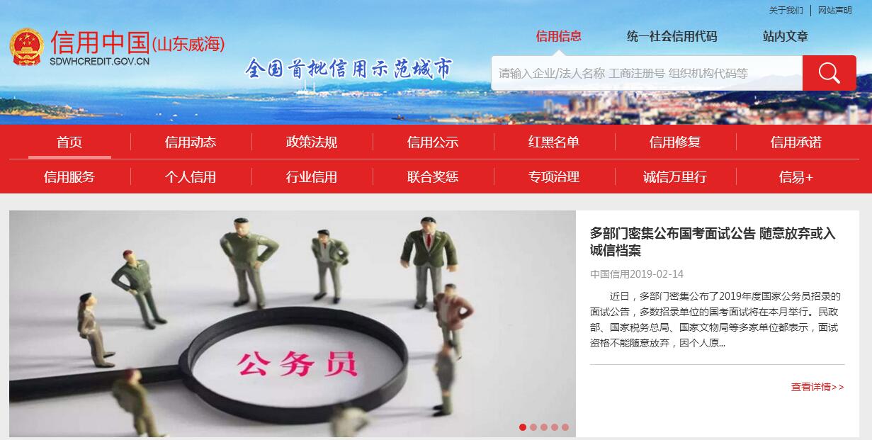 | 網(wǎng)站簡介: 信用威海網(wǎng)站是威海市社會信用體系建設(shè)工作對外宣傳的窗口,用于宣傳國家、省市信用工作動態(tài)和政策法規(guī);提供企業(yè)和個人信用信息的一站式查詢服務(wù);對行政許可、行政處罰、紅黑名單、行業(yè)分級分類結(jié)果、信用承諾等進行公示。 |