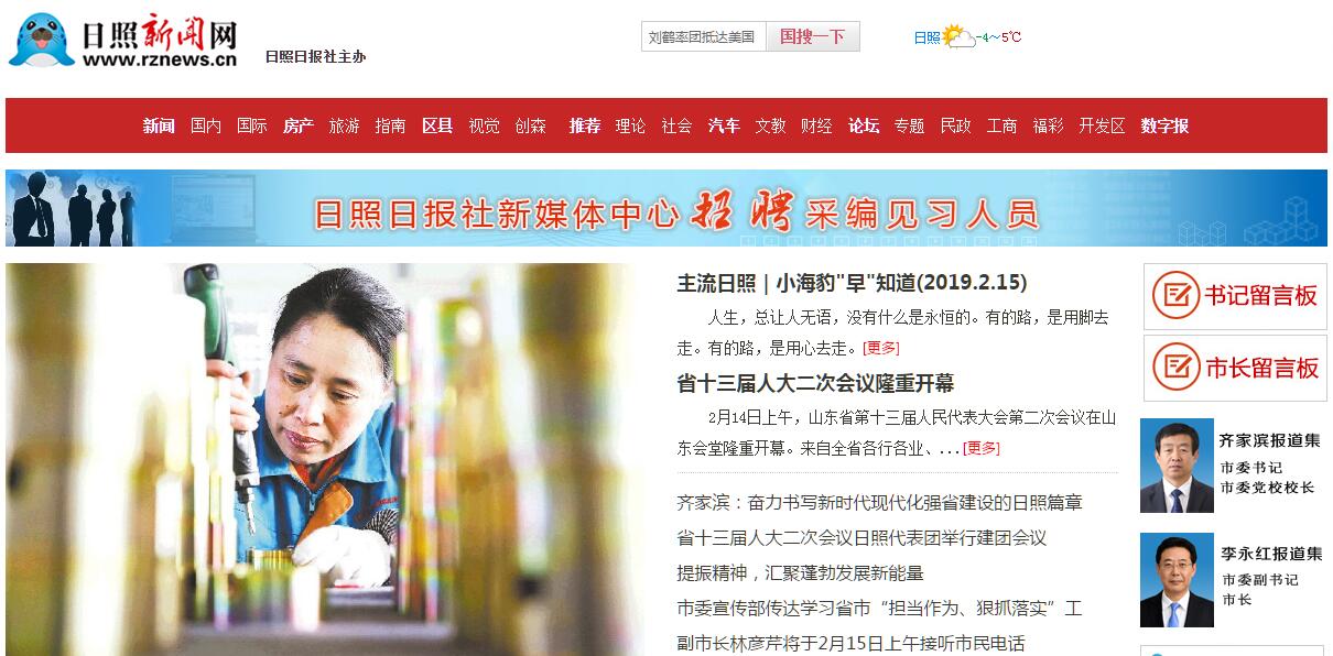 日照新聞網(wǎng)(http://www.rznews.cn/),日照第一門戶網(wǎng)站。是由日照日報(bào)社主辦、日照最具公信力最有影響力的主流綜合門戶網(wǎng)站,是中共日照市委、日照市人民政府重點(diǎn)打造的核心權(quán)威網(wǎng)站,也是山東省人民政府新聞辦公室批準(zhǔn)有采訪、發(fā)布新聞權(quán)的日照市的兩家網(wǎng)站之一。網(wǎng)站榮獲2011全國地方優(yōu)秀網(wǎng)絡(luò)媒體、2013全國地方網(wǎng)絡(luò)媒體最具人氣品牌十強(qiáng)、2014全國地方網(wǎng)站最具影響力品牌獎(jiǎng)、2016全國地方網(wǎng)絡(luò)媒體十大最具影響力品牌獎(jiǎng)等殊榮,“最日照”微信公眾號(hào)榮獲2016全國地方網(wǎng)絡(luò)媒體優(yōu)秀微信公眾號(hào)獎(jiǎng)。日照新聞網(wǎng)于2003年11月1日開通,2007年11月8日開通數(shù)字《日照日報(bào)》和《黃海晨刊》。數(shù)字報(bào)紙綜合運(yùn)用了文字、音頻、視頻、圖片等多種傳播手段,打造了全新的信息資源聚合平臺(tái)和傳播平臺(tái),這是山東省繼煙臺(tái)、威海、青島后第五家市級數(shù)字報(bào)紙,也是繼網(wǎng)絡(luò)化辦公后日照報(bào)業(yè)信息技術(shù)的又一次飛躍,使讀者無論何時(shí)何地,都能夠?qū)崿F(xiàn)便捷快速的網(wǎng)上讀報(bào)。數(shù)字報(bào)紙不僅保留了報(bào)紙版面語言的魅力,在版式上更尊重人們的閱讀習(xí)慣?!饕l道:日照新聞、視覺日照(日照圖庫)、日照論壇等。日照新聞網(wǎng)“我愛日照論壇”是市里重點(diǎn)打造的日照市網(wǎng)絡(luò)問政平臺(tái),有76個(gè)市直部門、單位上線。日照新聞網(wǎng)與中共日照市紀(jì)委、日照市監(jiān)察局、日照市政府糾風(fēng)辦、日照市人民檢察院及日照日報(bào)社聯(lián)合推進(jìn)此項(xiàng)工作?!绊憦V泛:日照新聞網(wǎng)已參與百度搜索及百度推廣;加入中國網(wǎng)絡(luò)聯(lián)盟、中國地市新聞網(wǎng)盟及山東網(wǎng)盟、中原網(wǎng)盟、淮海網(wǎng)盟等,可與全國各大新聞門戶網(wǎng)站合作策劃開展宣傳、運(yùn)營活動(dòng),網(wǎng)絡(luò)領(lǐng)域資源全面延伸。